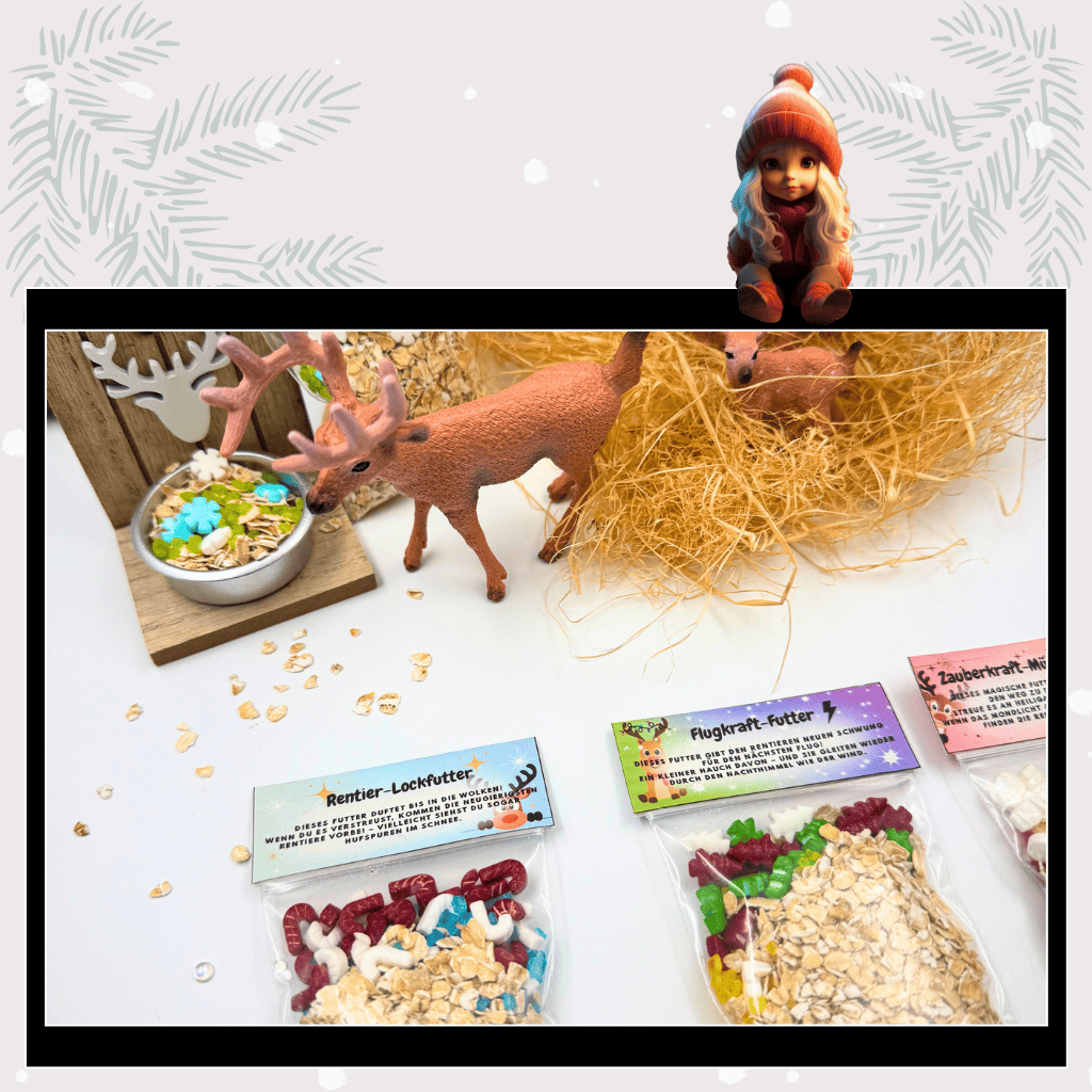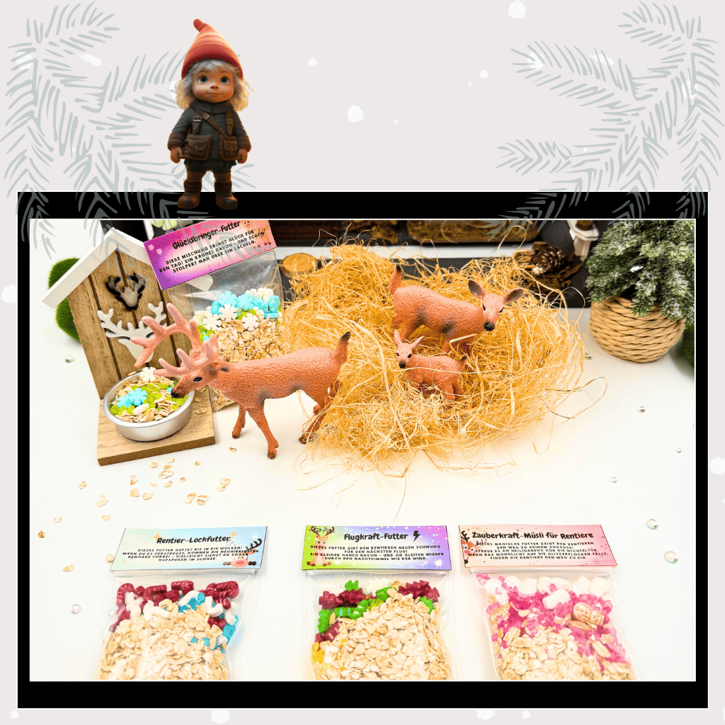 Entdecke das magische Rentierfutter – eine kostenlose Wichtelidee, die Kinderherzen höherschlagen lässt! 💫 Mit dieser liebevoll gestalteten Vorlage kannst du das Rentierfutter ganz einfach selbst herstellen. Egal ob Zauberkraft-Müsli, Glücksbringer-Futter, Rentier-Lockfutter oder Flugkraft-Mischung – jede Variante bringt ein Stück Wichtelmagie in dein Zuhause.
